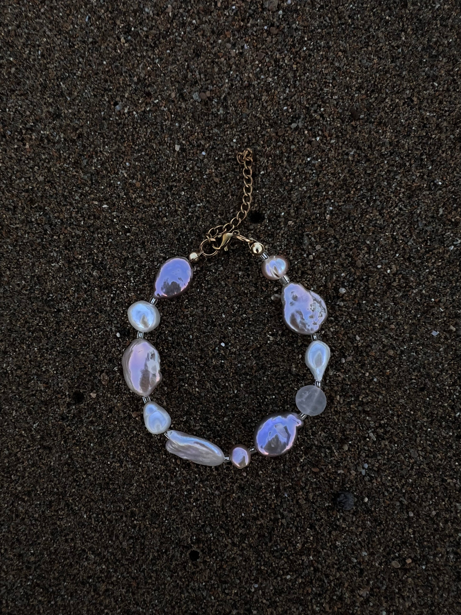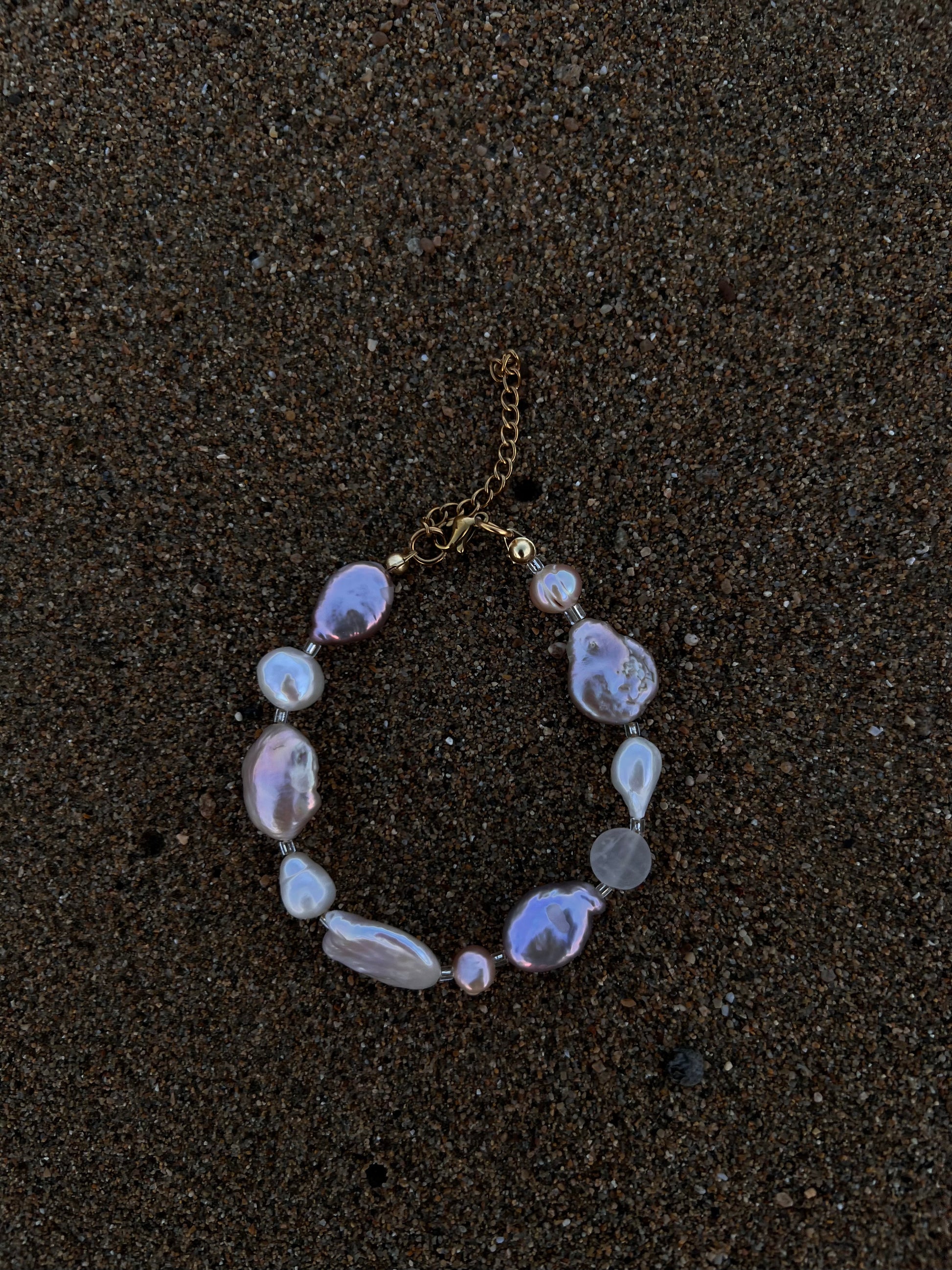 - Freshwater keshi, baroque pearls, semi precious stone, glass beads & stainless steel findings